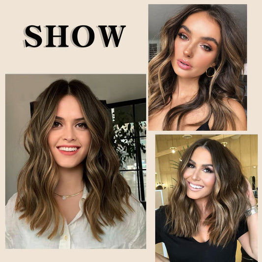 Short Bob Wavy Wig for Women Lace Front Wigs Ombre Brown Synthetic Wig Middle Part T Lace Wigs Heat Resistant Fiber for Daily Party Use